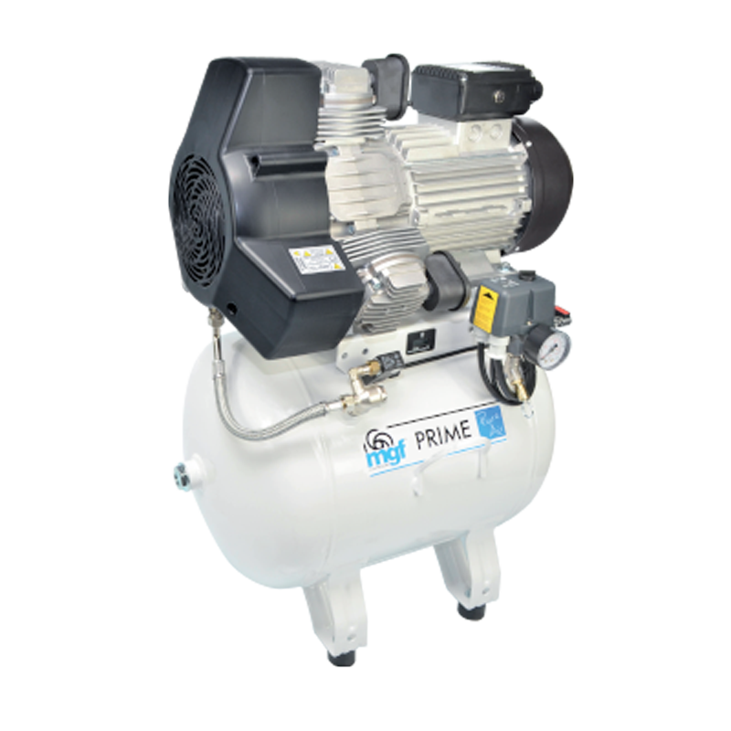 A tank-mounted air compressor is a self-contained, oil-free compressor system attached to a corrosion-resistant air storage tank. It supplies a steady, reliable stream of compressed air for dental and medical equipment, with the tank acting as a reservoir to maintain consistent pressure and meet peak demand without straining the motor. The oil-less design ensures clean, contaminant-free air (no oil vapors) for patient safety and the longevity of sensitive instruments. These compressors are engineered for high reliability (often capable of continuous-duty operation) and run relatively quietly, making them well-suited for clinics and labs where pure air and low noise are valued.
